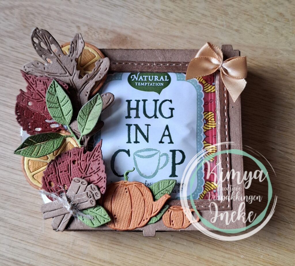 In het doosje heb ik theezakjes gedaan, maar je kunt het ook makkelijk vullen met een koek, chocolaatjes of snoepjes. Of wat je ook eigenlijk maar wilt.