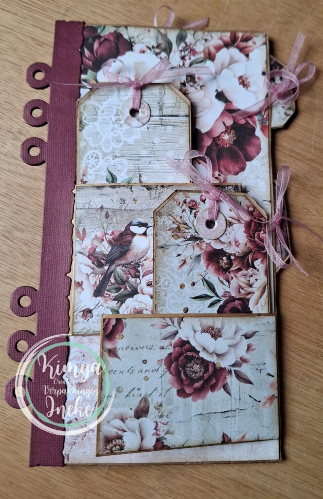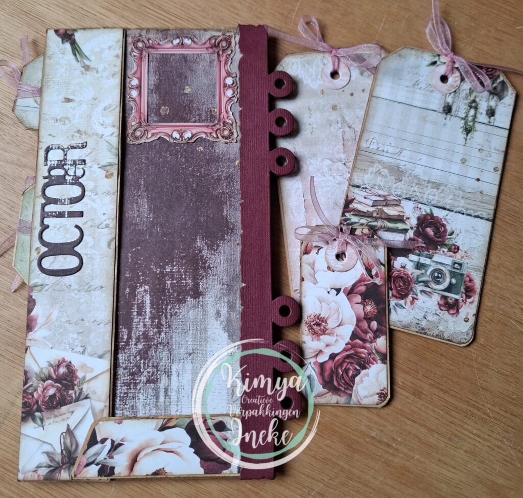 Materialen: Cardstock, Craft O ‘Clock Savor the Moment, Gummiapan Planner Border, Maanden Die, Tim Holtz Distress Oxide Ground Espresso, Kraftzak, Labels, Lint.