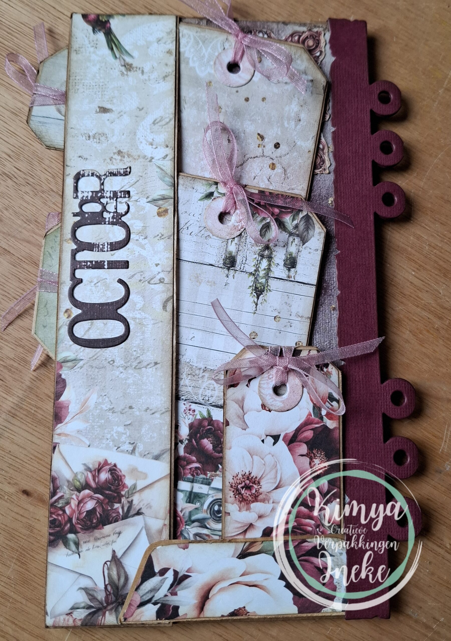 Om extra ruimte te maken, heb ik papier gescheurd en zo een extra laag gemaakt, waar weer een flink label in kan. Door het tussenstuk met de envelopjes is het label iets verstopt.