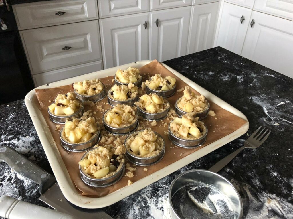 Op de bodem van de taartjes kwam een beetje banketbakkersroom en daarna de vulling van de appeltjes en rozijnen. Ik had wel de appeltjes eerst in de pan laten karamelliseren, aangezien ze nog een beetje erg stevig waren.