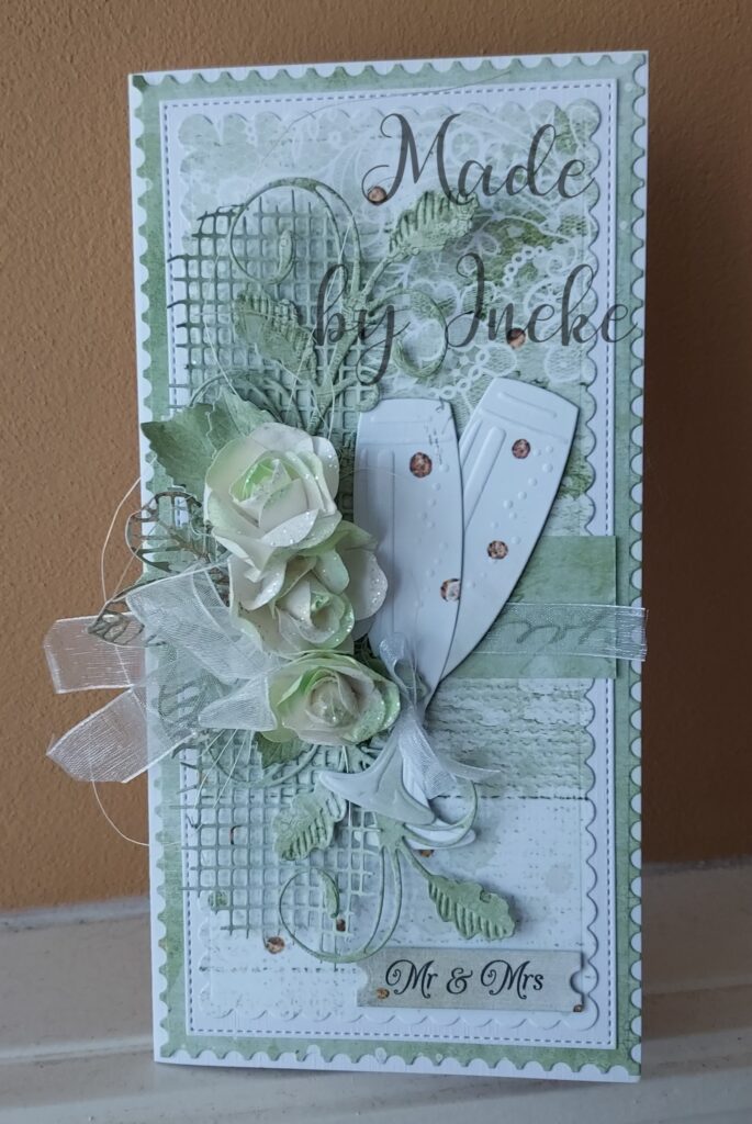 Hiervoor heb ik Greenery Invitations van Craft O’Clock gebruikt. Die past heel mooi bij een trouwerij. Ik had ook nog wat kant en klare bloemetjes met wat vaag groen en glitter, die er ook prima bij pasten.