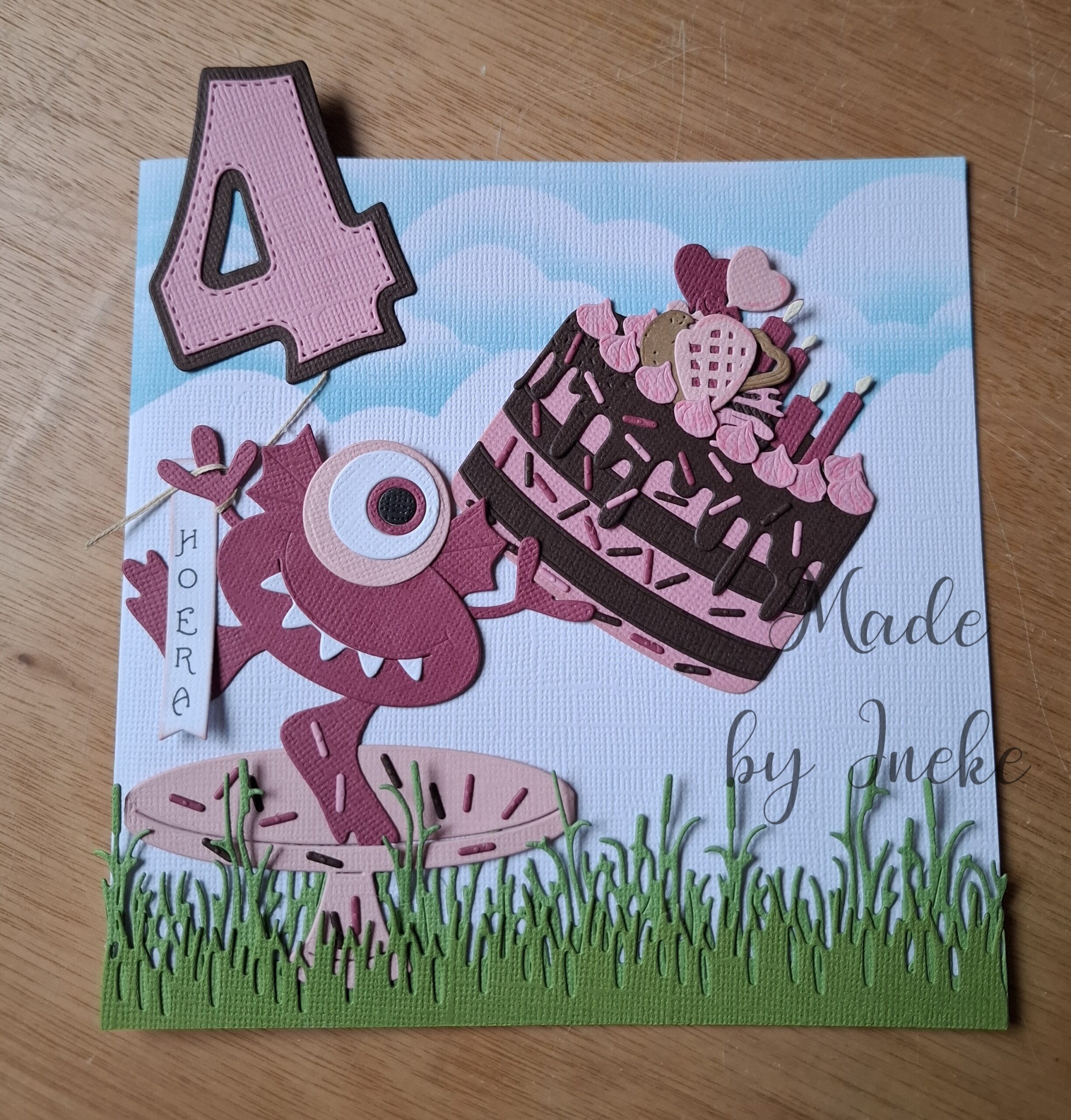 Ik vond het monstertje op de andere kaart van mijn kleinzoon zo leuk dat ik het voor haar ook heb gebruikt. Maar wel lekker met heel veel roze tinten.