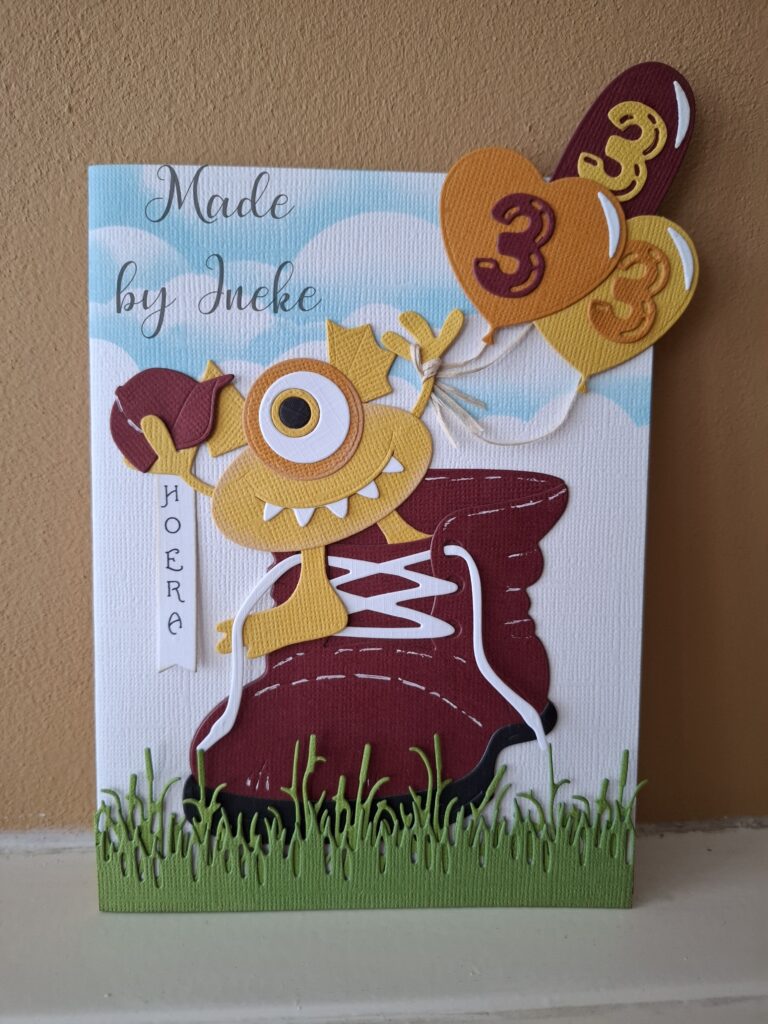 Voor het onderstaande kaartje heb ik gebruik gemaakt van een monstertje dat half in de schoen zit, en probeert de ballonnen goed vast te houden. De schoen heb ik nog wat extra witte accenten gegeven. En het monstertje vind ik helemaal niet eng. Ik vind hem wel grappig geworden!