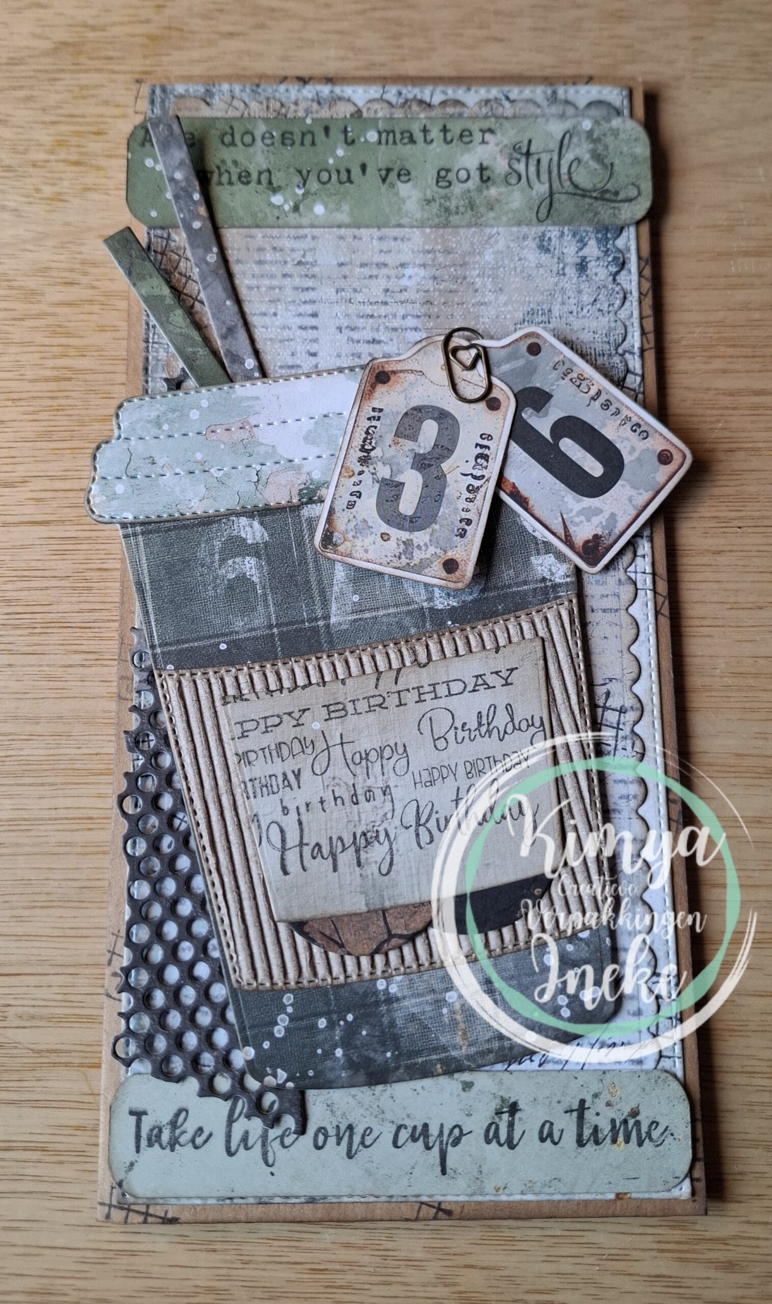 Materialen: Kraft, Ribbelkarton, Craft O’Clock November Man, Carlijn design Slimline Die, Elisabeth Craft Design Take Away Cup, Gummiapan Tekst stempels, Tim Holtz Distress Oxide Ground Espresso, Paperclipje.
