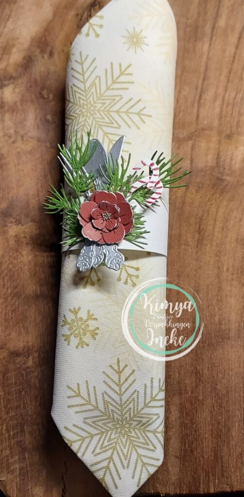 Ik heb een servetring gemaakt, voor op de kersttafel. Natuurlijk kun je die ook gewoon maken als je een ander feestelijk etentje gaat geven. Dan kun je gewoon de dennentakjes weglaten en er andere takjes voor in de plaats doen. Heb je nou geen stansjes van takjes, dan kun je ook een takje tijm of rozemarijn hiervoor gebruiken. Ruikt ook nog lekker!