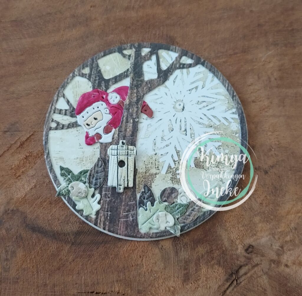 Materialen: Cardstock, Craft O’Clock Christams Everywhere + Autumn Beauty, Gummiapan Advents Calender + Raam + Mand + Kaneelstokjes + Bloemetje + ATC Stamp, Marianne Design PL6501, Tim Holtz Distress Oxide Ground Espresso, Acrylverf, Kraaltjes, Twine, Strikje.