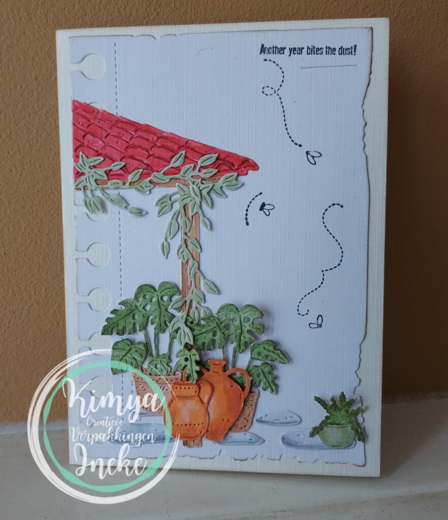 Materialen: Cardstock, Gummiapan Terrasdak + Antieke Urns + Klimop + Cactus in pot + Stepping Stones + Mosteraplant + Backgrund Die +Flies + Another Year Stamps, Copic Markers, Tim Holtz Distress Oxide Ground Espresso.