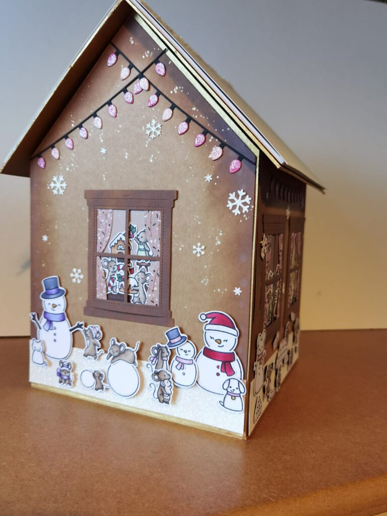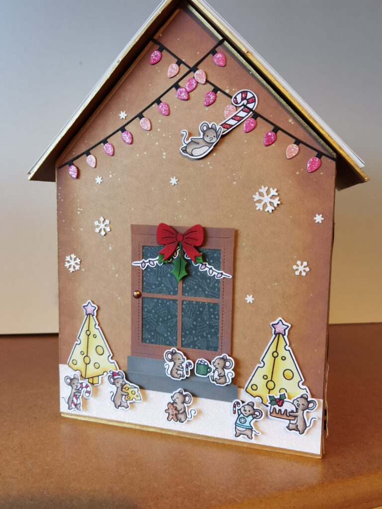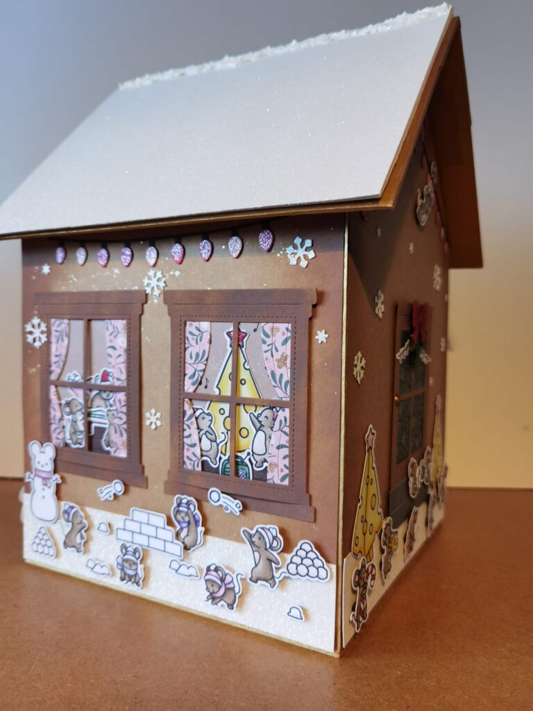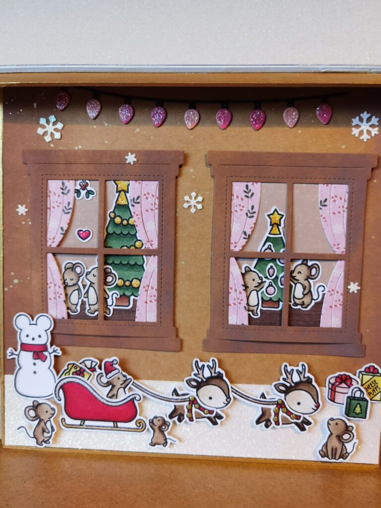 Ze heeft de hele huisjes beplakt en een soort sneeuwdakje gegeven. De aankleding van de huisjes rondom heeft ze allemaal gedaan met stansjes van Lawn Fawn. En niet geheel onbelangrijk, alle cadeaus en kaarten pasten er precies mooi in.
