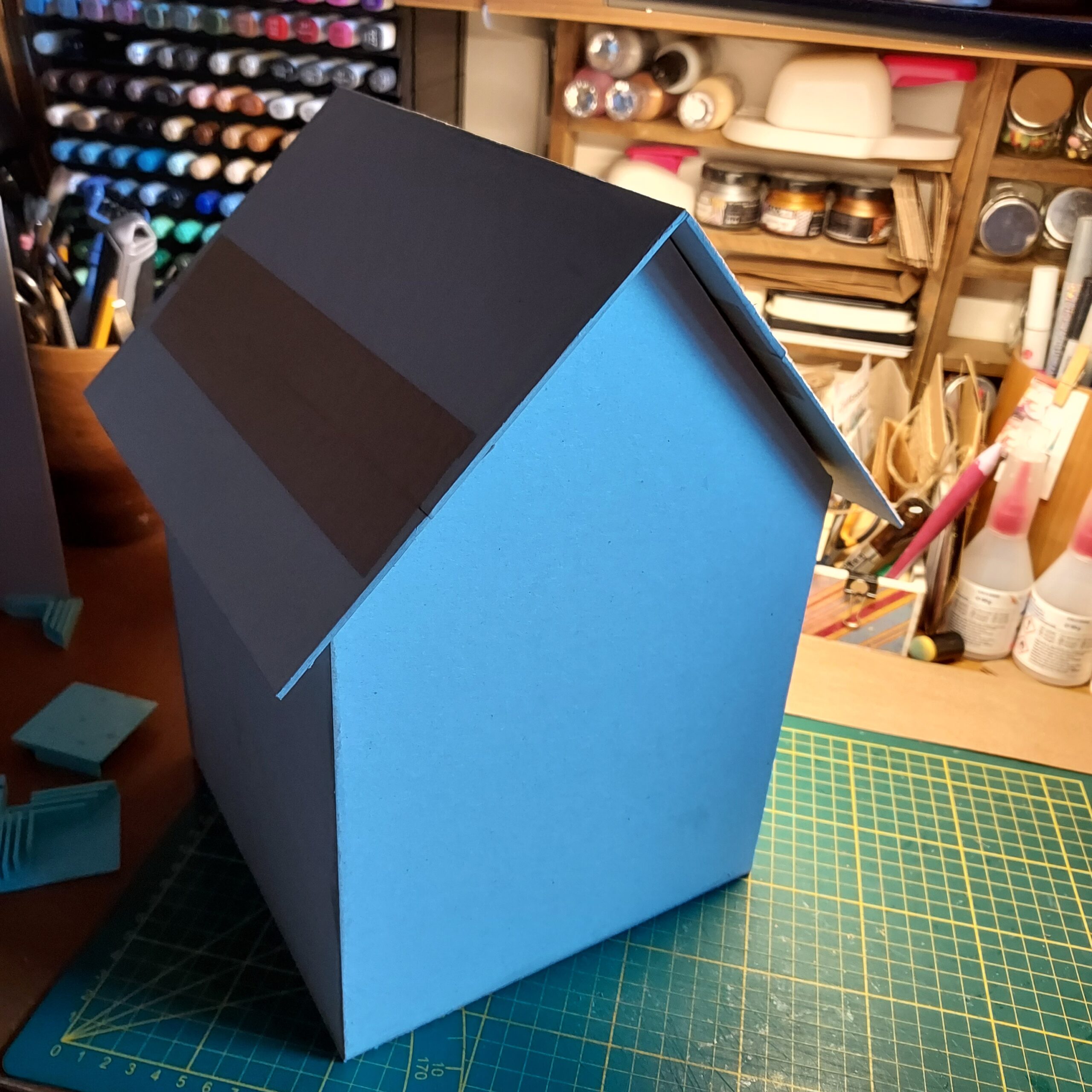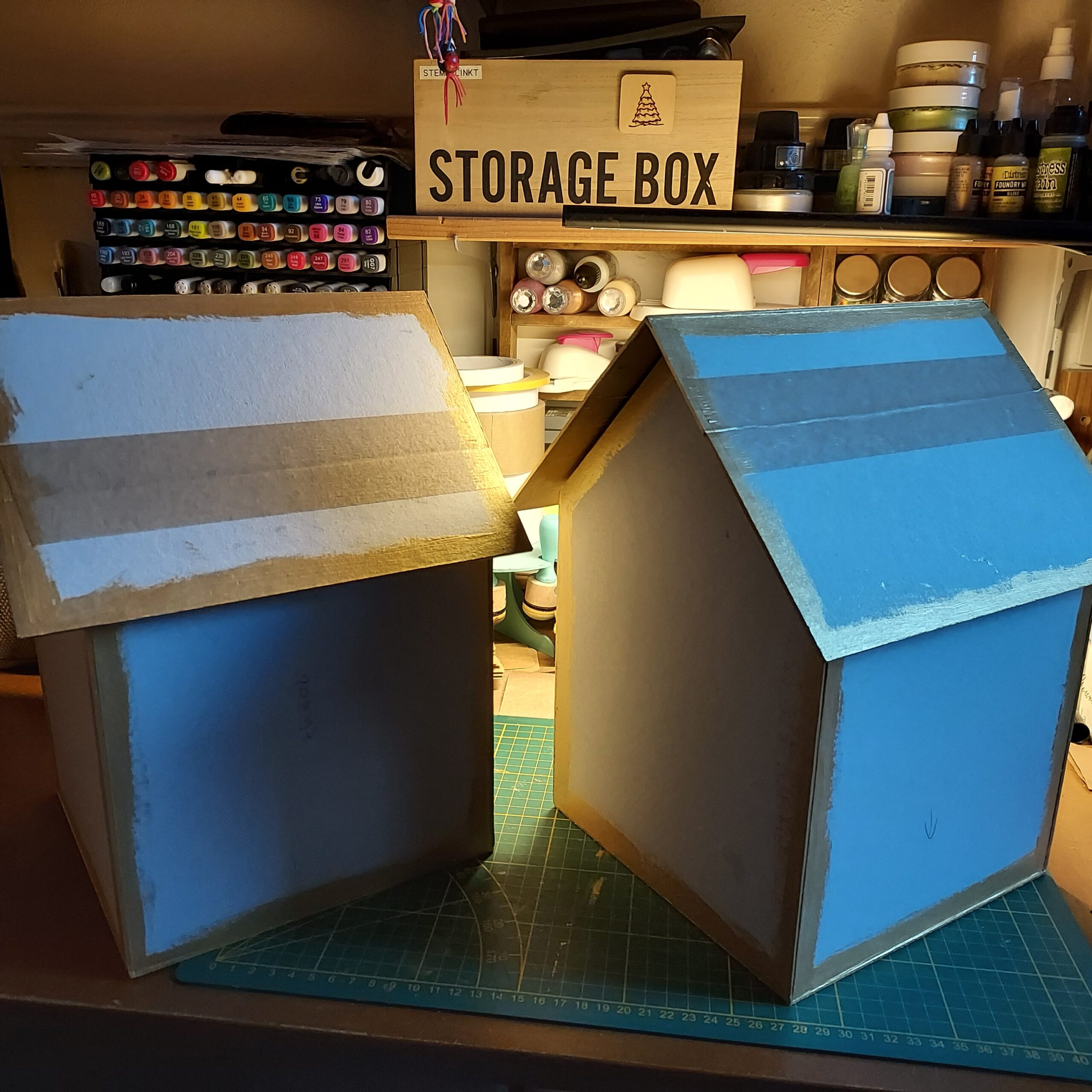 Dat heb ik dus gedaan, maar wel 2x, want het moesten 2 huisjes worden. De maat van het huisje is 20 x 20 x 20 cm, waarbij de hoogte van de voor-en achterkant 30 cm is. Van de restantstukken heb ik het dak gemaakt, door middel van lijm en tape. Daarna zou het toch beplakt worden. Dus stevig genoeg. Het dak ligt er ook los bovenop. Alle randen en en hoeken aan de binnen- en buitenkant heb ik daarna met goudverf beschilderd.