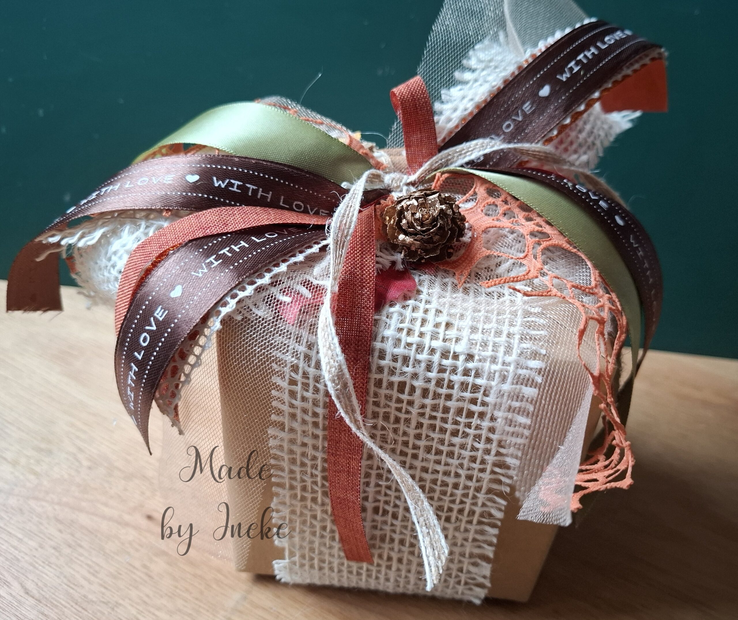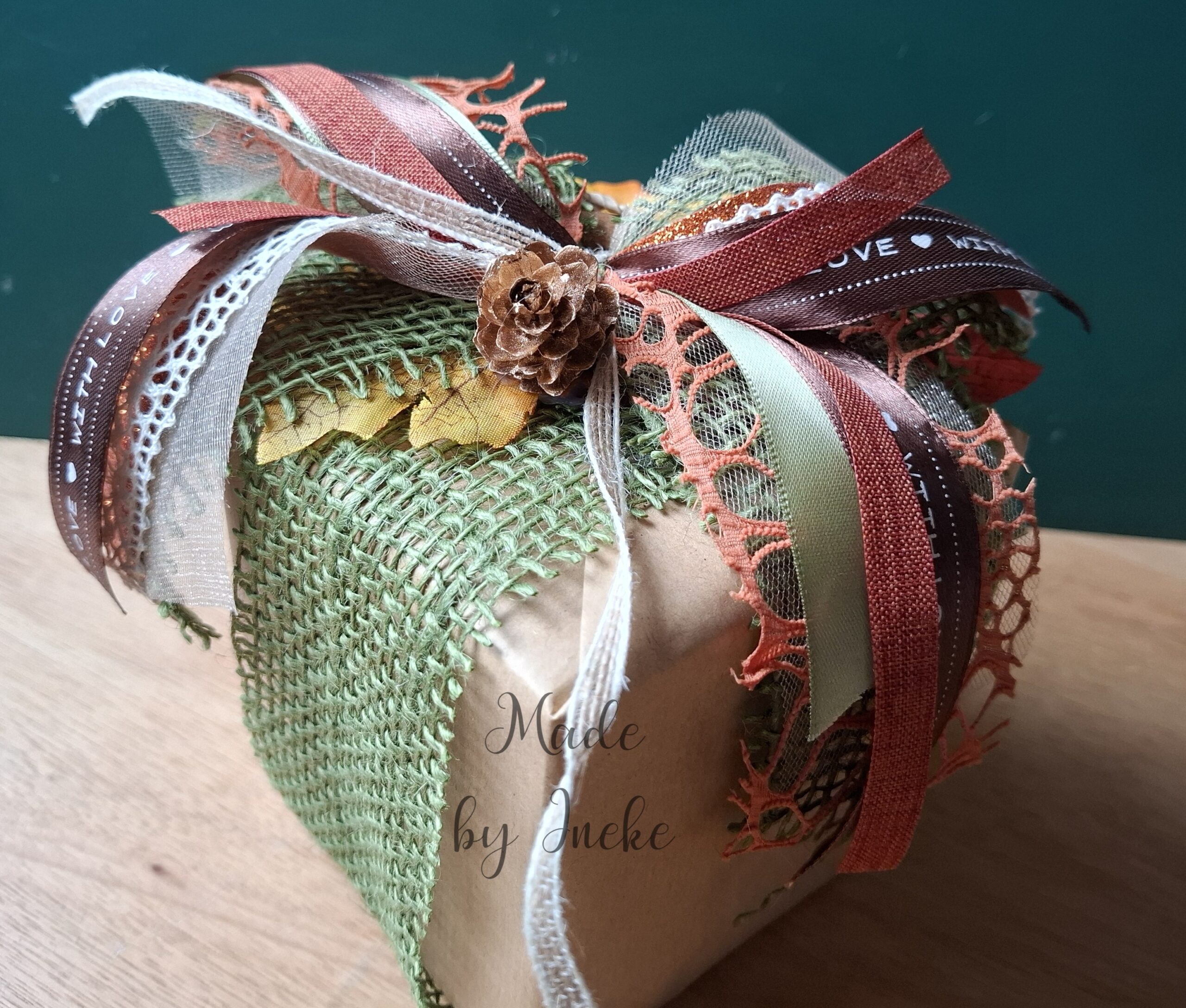 Ik had een vierkant doosje van 10x10x10 cm, waar het cadeau in zat, in gewoon pakpapier ingepakt. Een brede jute band erom heen geplakt en daarop een messy bow gemaakt. Daaronder zit nog wat herfstbladeren en verder wat extra versiering zoals kaneelstokjes.