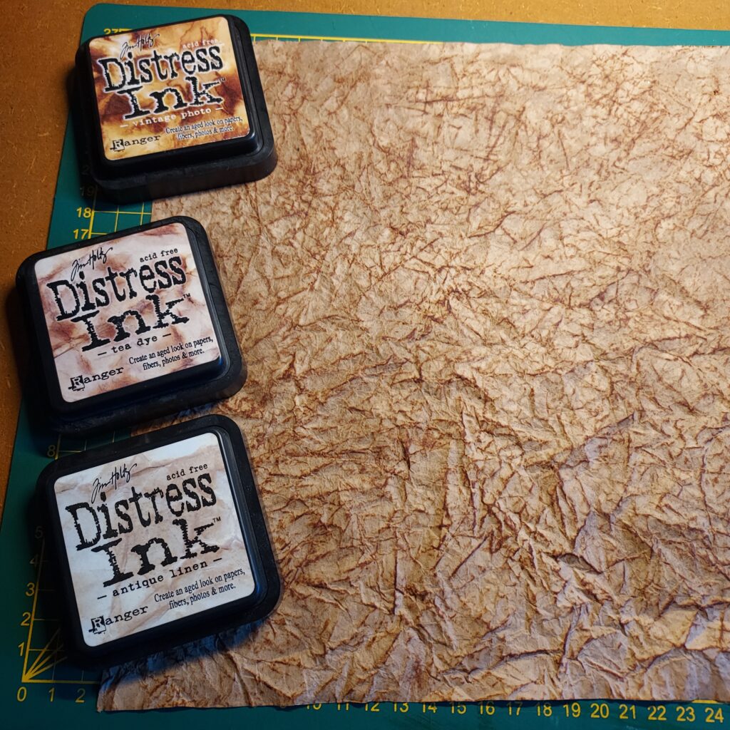 Materialen: Bruine papieren tas, Tim Holtz Distress Ink Vintage Photo + Tea Dye + Antique Linen.