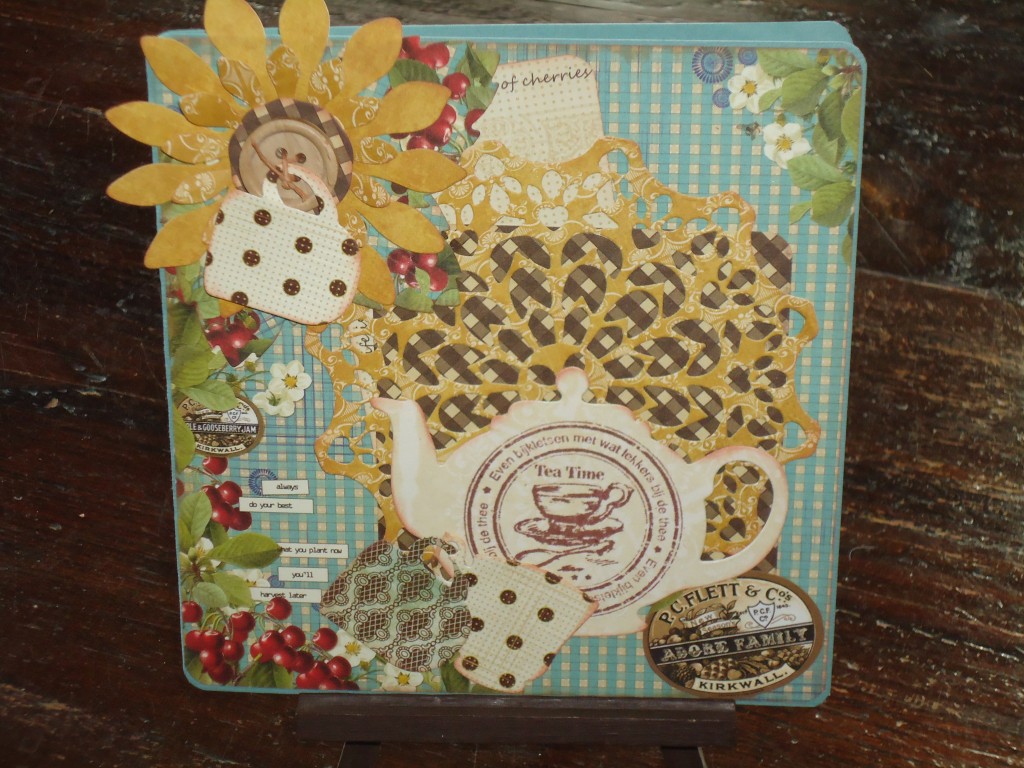 Materialen: Cardstock, Webster’s pages paper, thee pot stempel, Cheery Lynn doilie, Joy! Die bekers, Spellbinders zonnebloem die, knoopje, cat’s eye ink, Memories inkpad Artprint Brown, scrappers floss.
