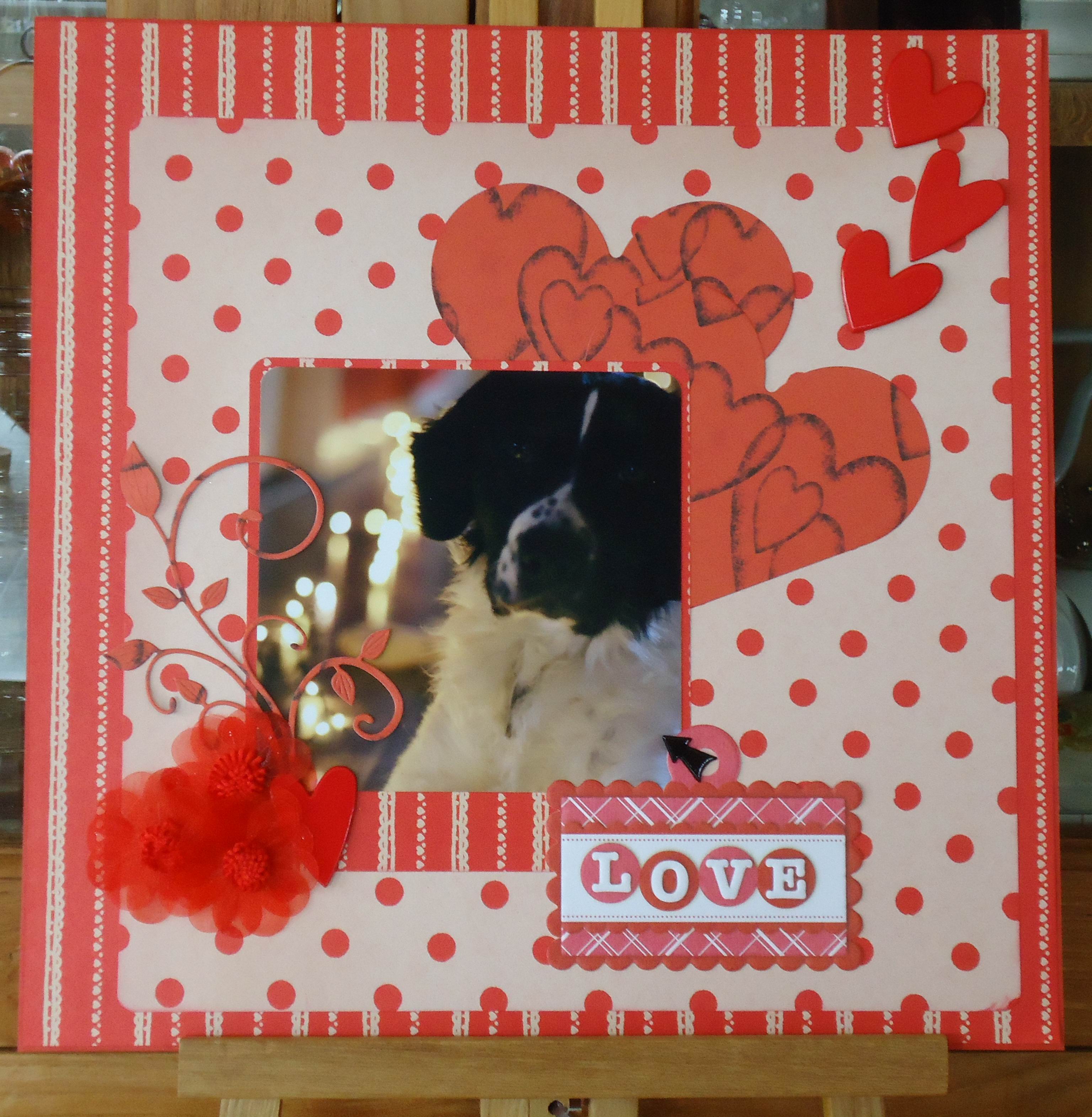 In the red/white patterned paper you can find hearts and the big hearst are also made from hearts patterned paper. The big brads are the premade hearts and the arrow next to the picture is also a brad.