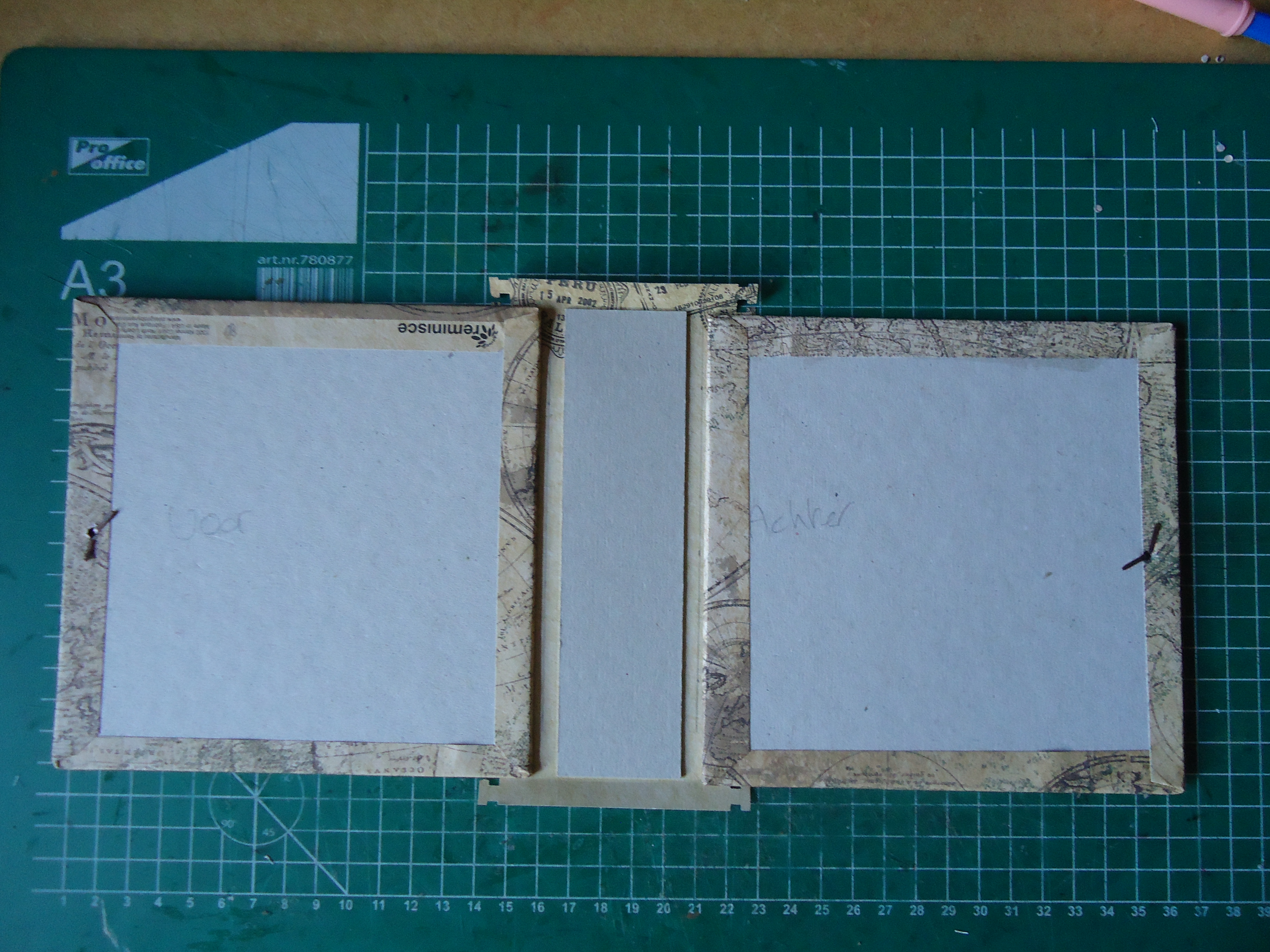 Dit boekje heeft de maat van 15×15 cm. Voor de rug heb ik 2 stroken gesneden van 4×15 cm waar de ringband op bevestigd zal worden. Voor de materialen heb ik gekozen voor bronskleur omdat die beter bij het papier passen.