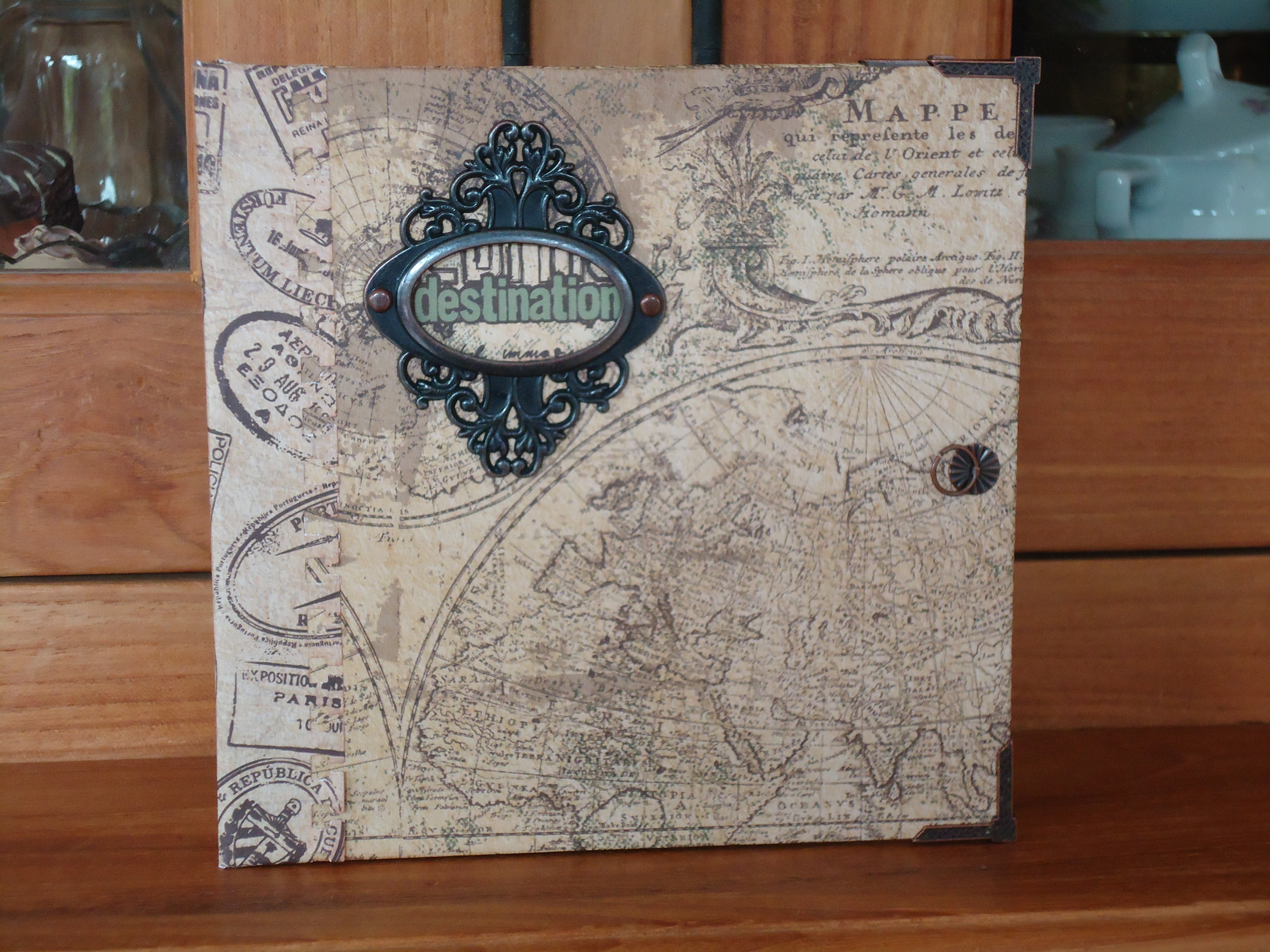 Materialen: Board karton 2x 15×15 cm en 2x 4×15 cm, Reminisce Expedition Destination, Tim Holtz Idea-ology Ring Binder Large + Ring Fasteners + Swivel Claps + Ornate Plates, metal corners, Color Box cocoa.