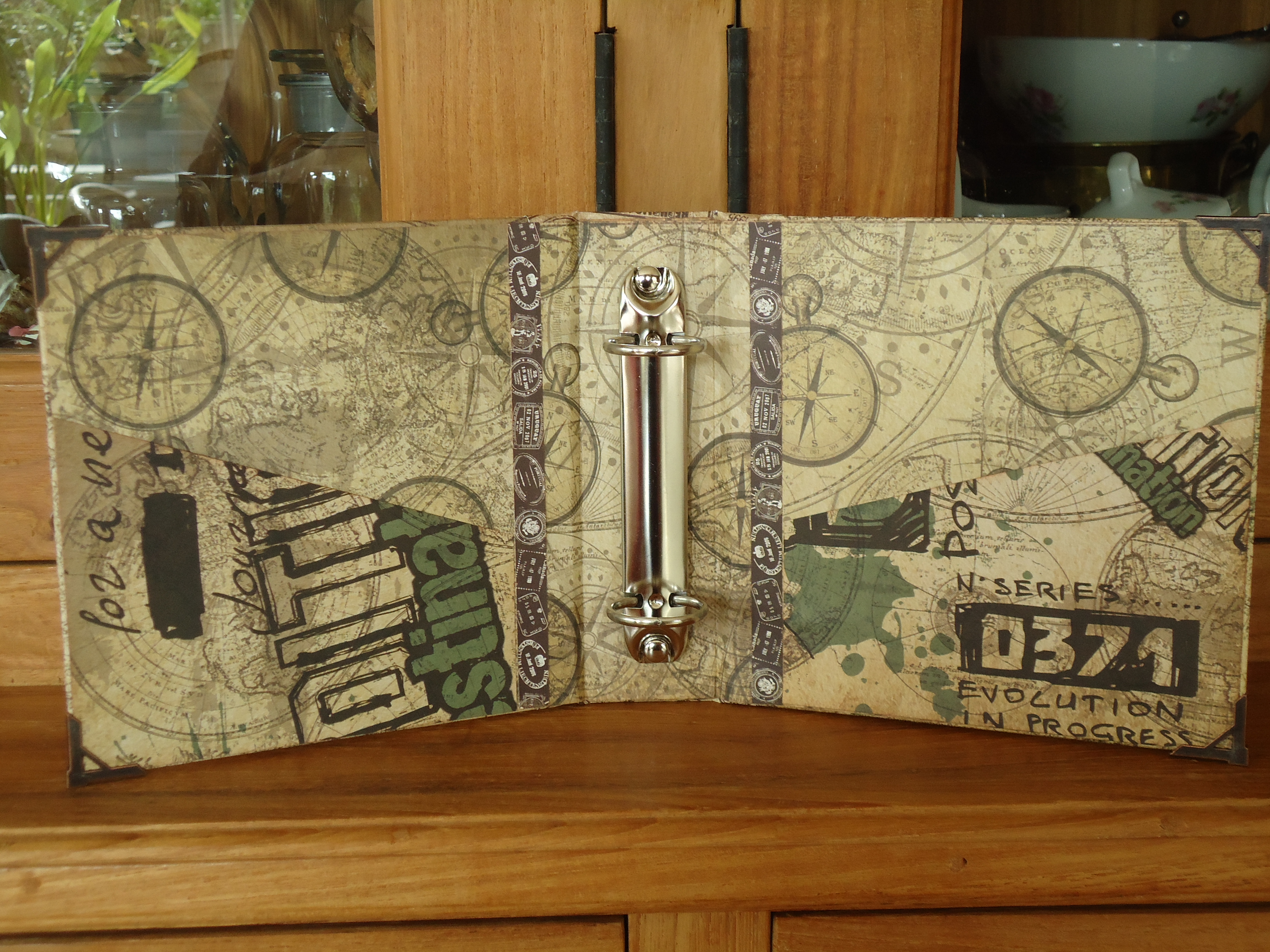 Inmiddels ben ik alweer verder met het travel boekje. Eerst heb ik de schutbladen en de rug bekleed met het dessin papier. Daarna de ringband bevestigd. voor het in elkaar zetten heb ik wel eerst de ornate plate en de ring fasteners bevestigd. Vervolgens heb ik het geheel in elkaar gezet.