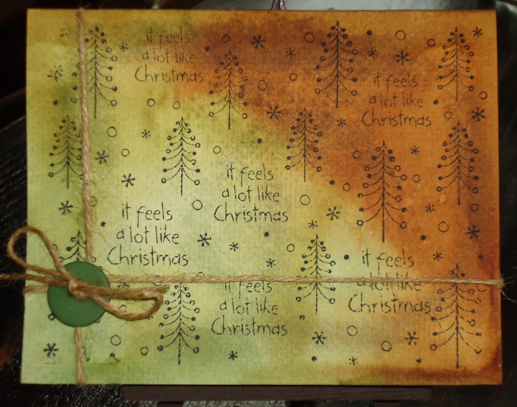 Materialen: Kaartenkarton, Tim, Holtz distress ink & stain Vintage photo, bundeld sage en forest moss, achtergrond stempel, touw, knoopje.