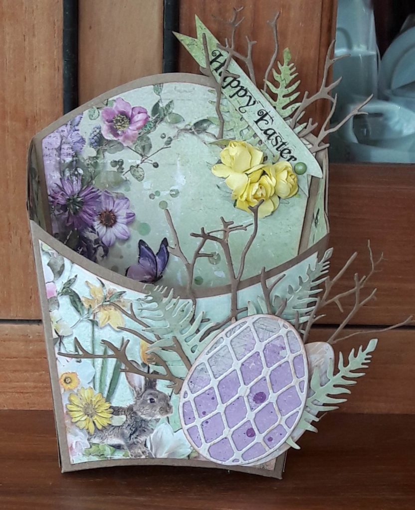 Materialen: Materialen: Kraft, Dutch Doobadoo mal French Fries, Studio Light scrappapier, Cheery Lynn Easter Egg Die, Free Die Simply Cards & Papercraft, CraftEmoitions Die Branches + Frond, Color Box Cat’s Eye Ink, roosjes, brad.