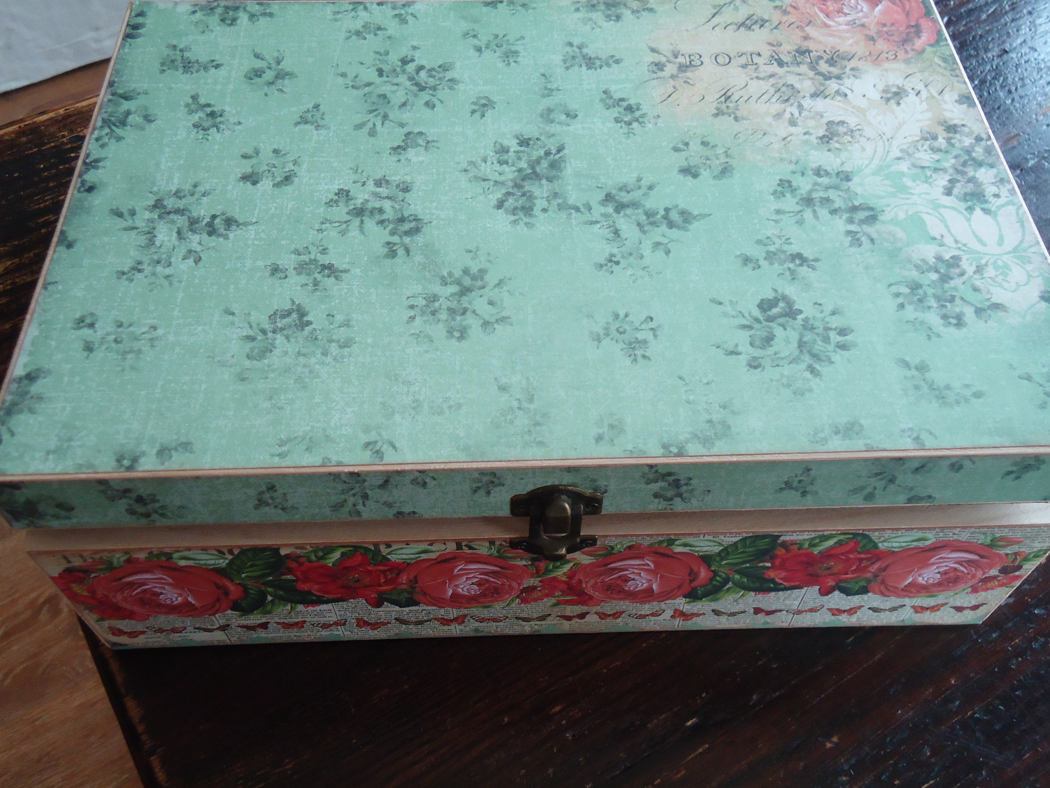 Materialen: Houten naaidoos, Kaiserkraft Curiosity Collection, Rood papier, Sizzix Die Susan’s garden Mini Petal+Rose, Die-Namits Leafy Branch, Color Box Cat’s Eye Ink Cocoa, Joy!Crafts lint, Glimmer Mist Gold, Houten klosjes.